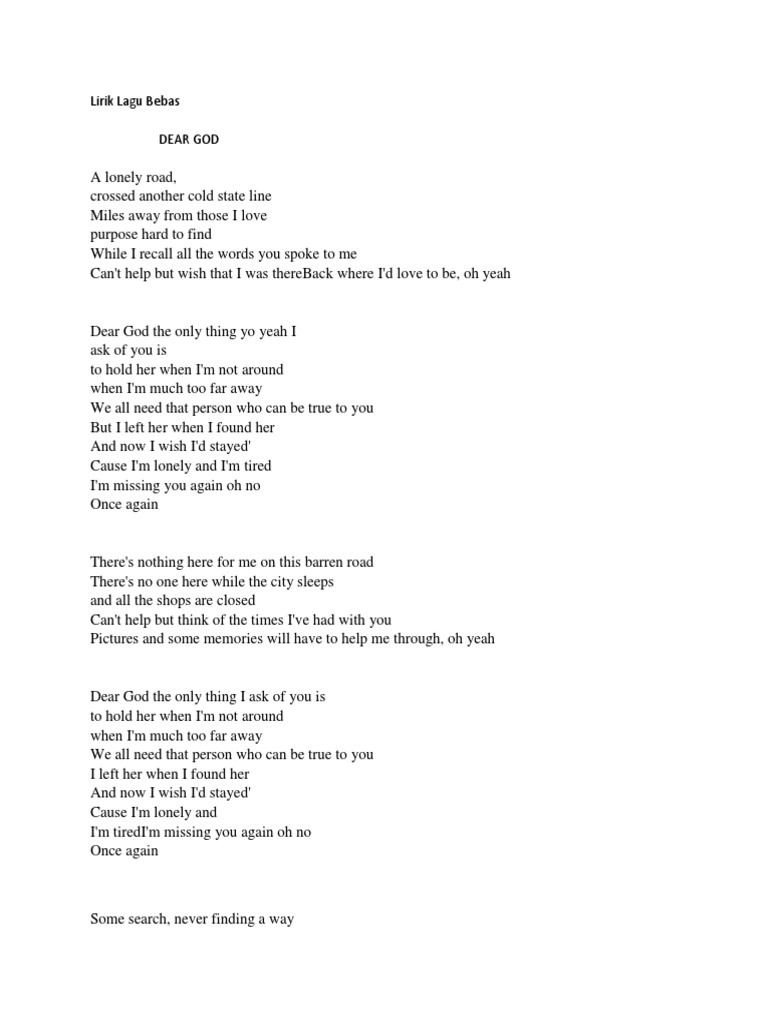 Dear God Lirik - Dear god, hope you get the letter and i pray you can make it better down here i don't mean a big reduction in the price of beer but all the people that you dear god don't know if you noticed but your name is on a lot of quotes in this book and us crazy humans wrote it, you should take a look and all.