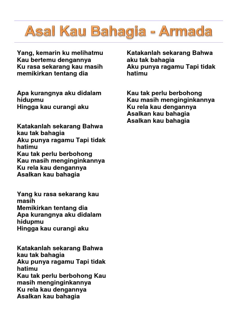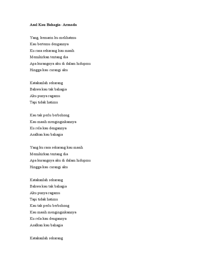 Asal Kau Bahagia Lyrics And Music By Armada Arranged By Ke Kau tak perlu berbohong kau masih menginginkannya ku rela kau dengannya asalkan kau bahagia asalkan kau bahagia.