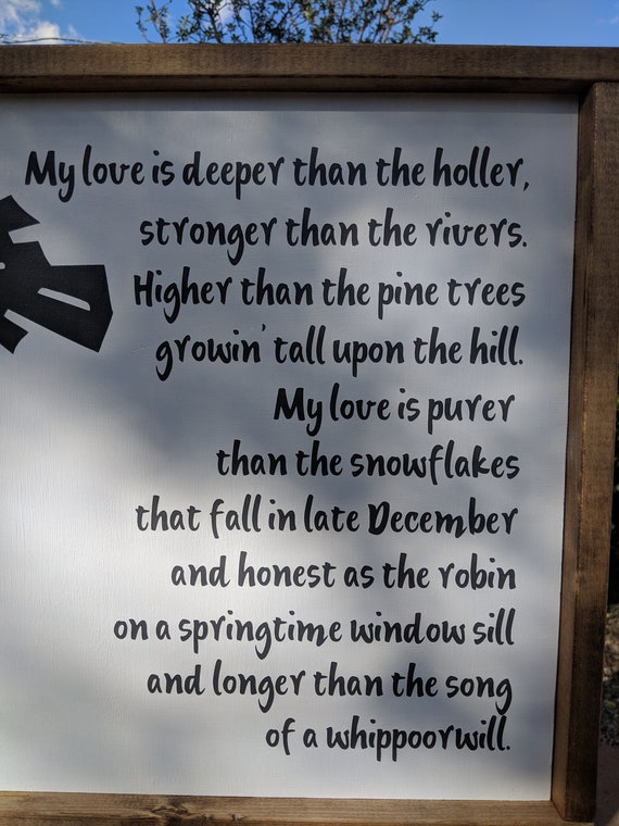Dear Diary My Love Is Deeper Than The Holler Stronger Than The River Higher Than The Pine Trees Country Love Quotes Dear Diary Cute Couple Pictures My love is deeper than the holler, stronger than the rivers higher than the pine trees growin' tall upon the hill my love is purer than the snowflakes that fall in late december and honest as a robin on a springtime window sill and longer than the song of the whippoorwill.